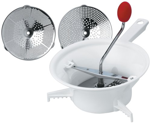 Sunbeam's 2-quart Food Mill includes 3 interchangeable stainless steel blades for versatility. Fine blade purees fruits and vegetables. Medium blade leaves some texture. Use the coarse blade for ricing potatoes or preparing tomatoes for sauce. All blades work like sieves. Handle rotates with ease for simple operation. Base rests over many posts or bowls for convenience. Dishwasher safe -top rack only.